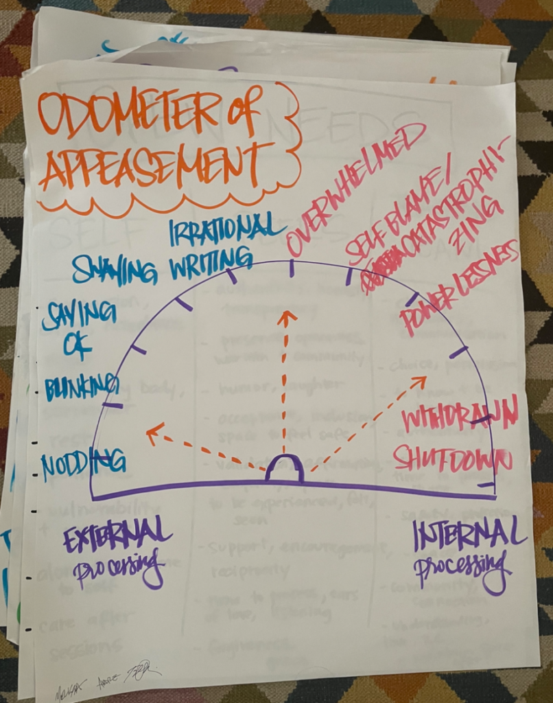 In the middle of the semester, we started doing work investigating how we cope, and how we react to major stressors or triggers. The assigned media and text leading up to that session gave me a lot to think about. I was body-scanning at work during stressful interactions and then journaling about the material at home. I really dug in and discovered that even though I present as a “Fighter” (on the Fight, Flight, Freeze, Appease scale,) I’m actually more of an appeaser. Since the members of my W.I.G. weren’t in class, my makeshift group was with two of the co-facilitators. They encouraged me to talk through how I discovered this big area of just coping with what I was discovering was my boss’s unpredictability and gaslighting. As I workshopped it with them, we co-created an Appeasement Meter, investigating the activation points that trigger the appeasement and what it looks like at each point. I felt proud of that work like, damn, look at this! I am sharing! I’m not in control of the entirety of this project! I can feel all of these feelings and I’m not dying! This is great!
